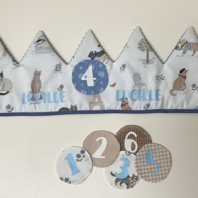 Herbruikbare verjaardagskroon uit stof met 6 cijfers. Enkel op bestelling, naam en thema naar keuze. (Zet je idee, naam,thema,... in communicatie of stuur me een berichtje!)